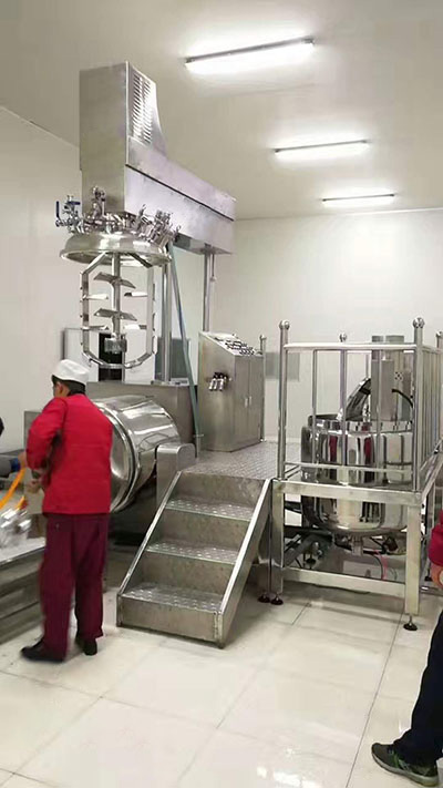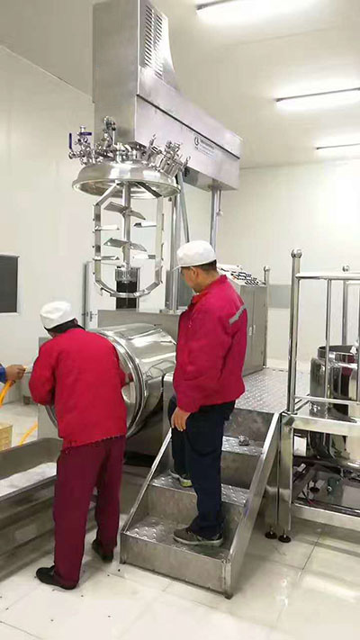 物料在水鍋、油鍋內(nèi)通過(guò)加熱、攪拌進(jìn)行混合反應(yīng)后,由真空泵吸入乳化鍋,通過(guò)乳化鍋內(nèi)上部的中心攪拌、聚四氟乙烯刮板始終迎合攪拌鍋形體,掃凈掛壁粘料,使被刮取的物料不斷產(chǎn)生新界面,再經(jīng)過(guò)葉片的剪斷、壓縮、折疊,使其攪拌、混合而向下流往鍋體下方的均質(zhì)器處,物料再通過(guò)高速旋轉(zhuǎn)的切割輪與固定的切割套之間所產(chǎn)生的強(qiáng)力的剪斷、沖擊、亂流等過(guò)程,物料在剪切縫中被切割,迅速破碎成200um-0.2um的微粒,由于乳化鍋內(nèi)處于真空狀態(tài),物料在攪拌過(guò)程中產(chǎn)生的氣泡被及時(shí)抽走。采用抽真空的方式,使所生產(chǎn)的制品在攪拌過(guò)程中不再混入氣泡,從而保證可制造出富有光澤、細(xì)膩及延展性良好的產(chǎn)品。