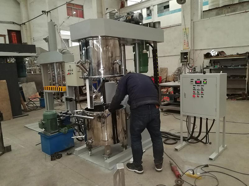 200L雙行星混合攪拌機有高速、低速、活動刮板作攪拌、剪切、刮壁、溶解用。低速運轉的攪拌錨使物料在密閉容器內上下翻動、剪切和混合,高速運轉的齒形分散盤與混合的物料產生強烈的碰擊和剪切,隨著攪拌錨的旋轉,行星架上的活動刮刀隨著旋轉,把釜體上的物料完全刮掉,使聚集物完全、徹底地達到混合、分散、溶解的要求。在其高低速的不同作用下,使物料能夠達到均勻的混合和分散。